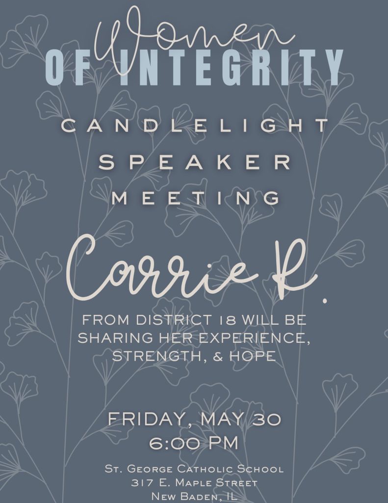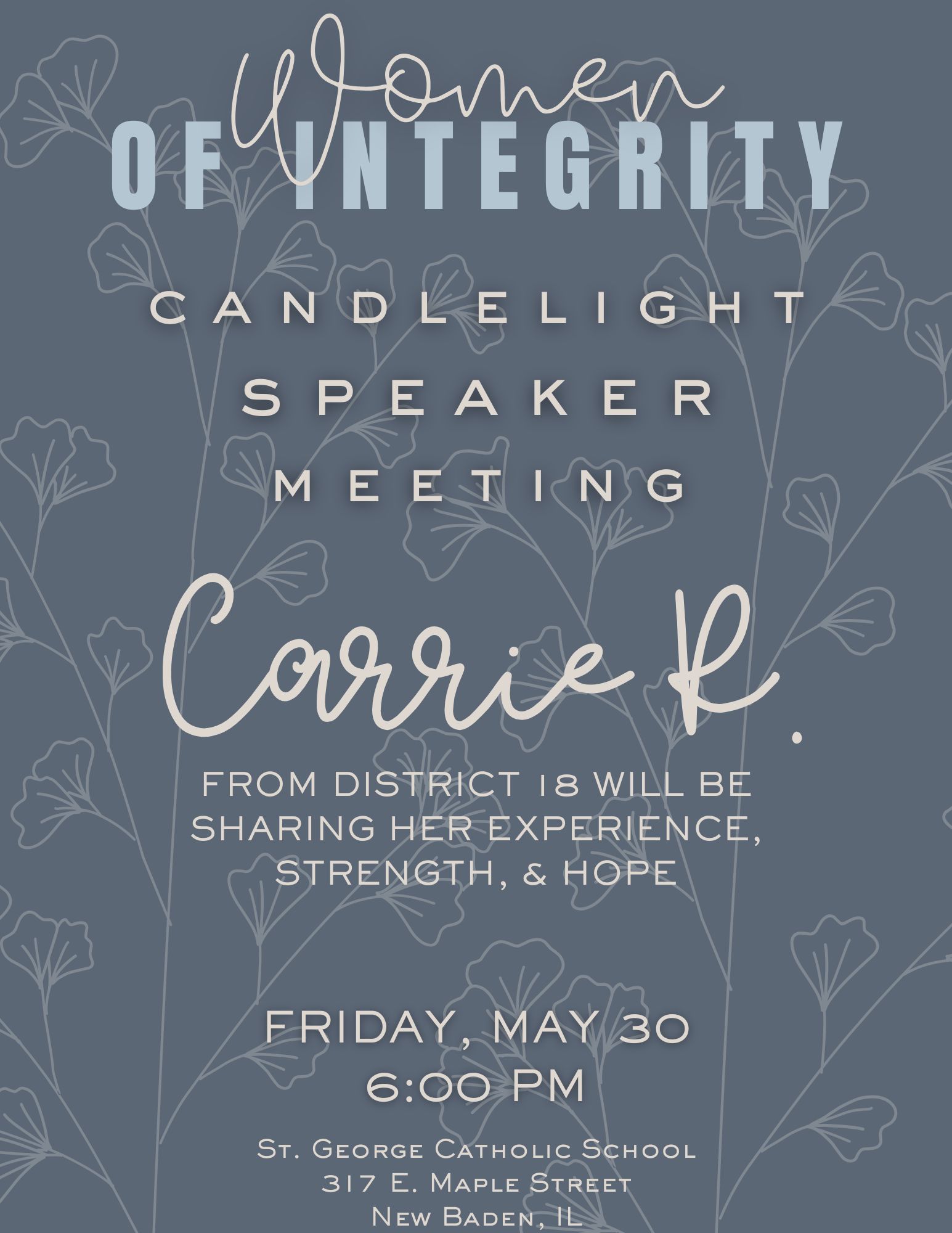 Come hear our good friend Carrie R. share her experience, strength, and hope at the Women of Integrity Candle Light Speaker Meeting!